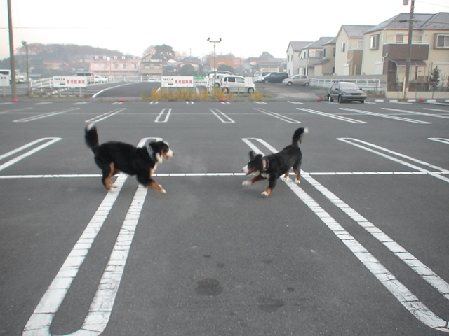 毎朝、ブイの散歩が終わってからシェビー&ラムの散歩。